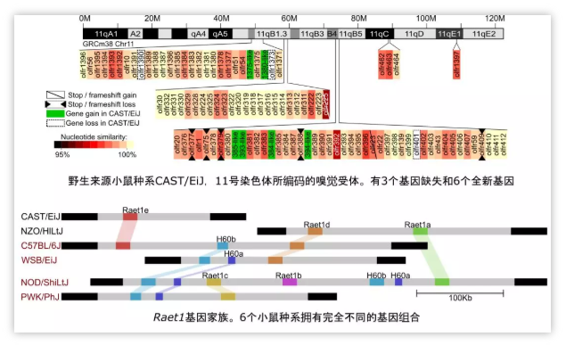 令人意外的是,在小鼠基因组,类似于MHC的高度多态性区域多达数千个,占小鼠基因组的0.5-2.5%,编码1.5-5.5%的蛋白。这些区域被称作“种系特征区”。通过基因道(gene ontology)分析,种系特征区主要编码免疫、感知、神经、行为、有性繁殖和亲属辨认相关基因。与基因组中其他部分不同,这些区域编码了大量全新基因。除非是同卵双胞胎,否则不同个体所携带的序列很可能完全不同。以野生来源近交系WSB/EiJ为例,它与参照基因组C57BL/6J遗传学相距1万年左右,却在IRG,Nlrp1,Raet1等多个区域携带全新等位基因,差异超过大鼠/小鼠间距离,即1200-2400万年。这些基因的组合是WSB/EiJ独有的,与其他15个种系均不相同。